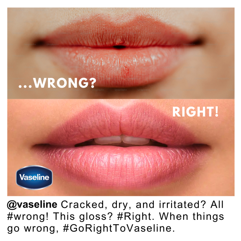 - This above proposed billboard is deliberately simple, both in text and imagery. The things that go “wrong” are easily identifiable to the target audience: Cracked lips, dry skin, and unkempt brows are instantly noticeable to the young, beauty-conscious crowd that Vaseline hopes to attract with this campaign, especially when put directly in contrast with the “right” alternatives shown below them. The “wrong” and “right” versions are also accompanied by their identifying words; The word “wrong” is featured in the top line of images, and the word “right” is placed on a separate line along with the bottom line of images, providing another visual clue to the viewer as to what the overall message of the campaign is.