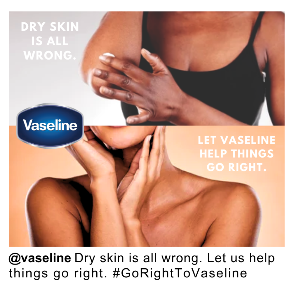 - Regarding the proposed captions and particularly the draft blog post/webpage copy about this campaign, while Vaseline has been around for over 150 years, its contemporary branding does not let its age show. The Instagram and TikTok pages for Vaseline feature content and captioning that are lighthearted, entertaining, and reflective of current social media trends. A March 18, 2025 post about Vaseline lip gloss is captioned, “Tag the bestie you always vibe with” along with a litany of emojis and hashtags.