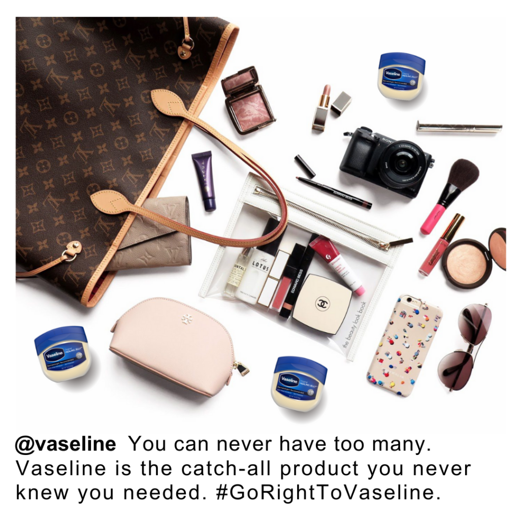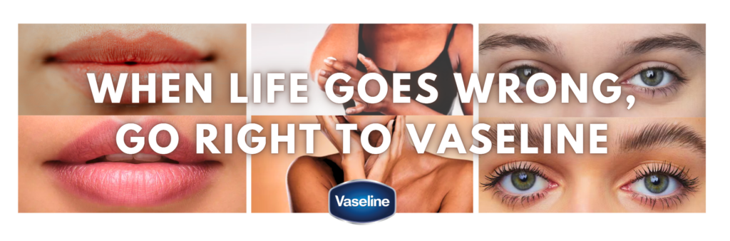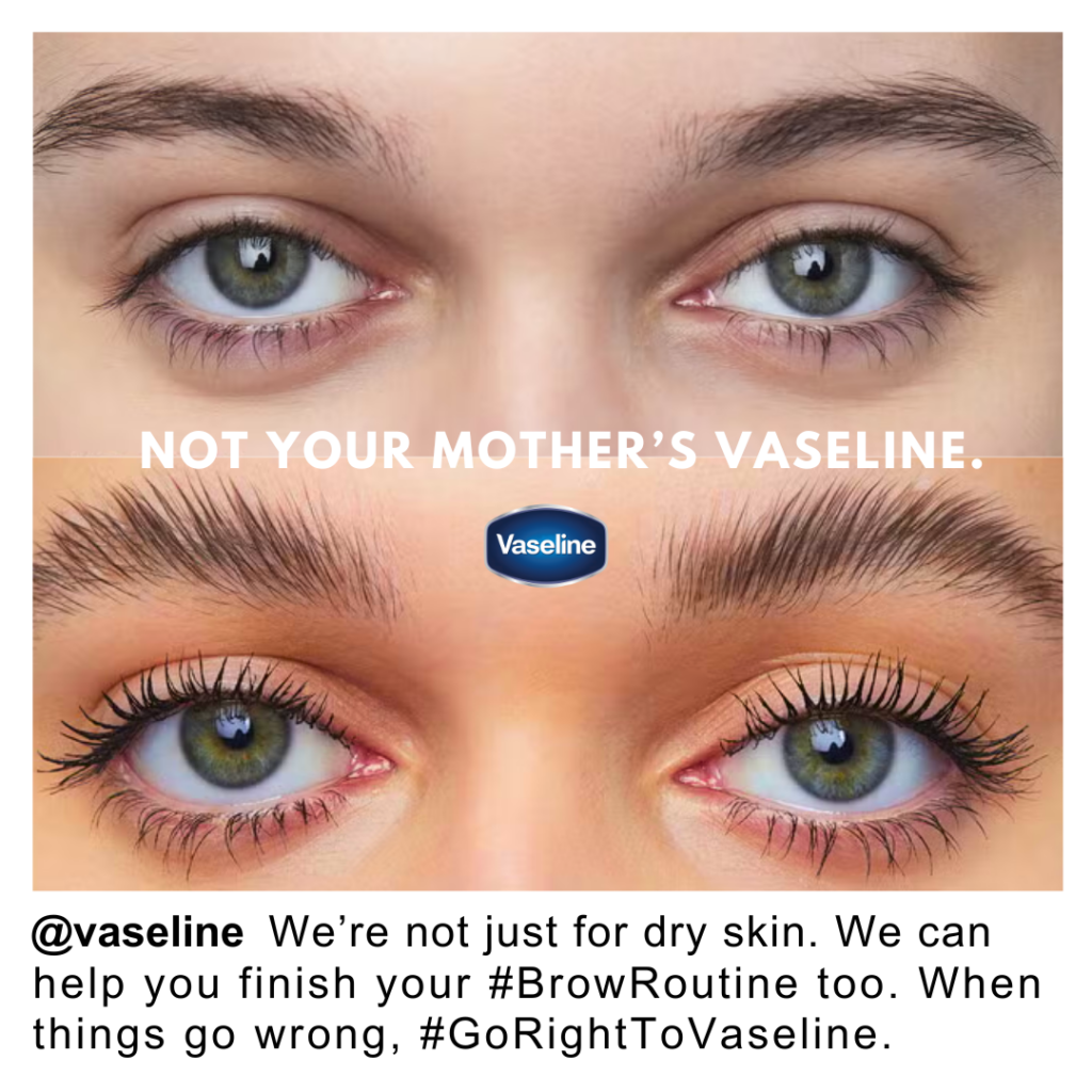 - Vaseline is also traditionally associated with wound care or a tool near-exclusively for severely dry skin moisturization. Illustrating that a product as simple and ubiquitous as Vaseline can be used to achieve coveted and otherwise expensive-to-achieve eyebrow or lip gloss looks will best draw this audience’s attention further.
